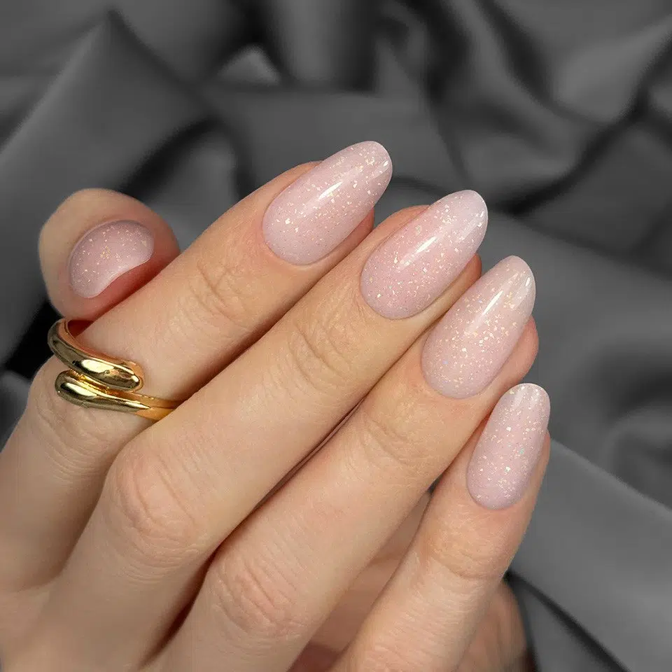 But that’s not all – Cute Ariel also delights with its multi-coloured particles, which are embedded in the structure of the gel. They shimmer like fairy dust in the rays of light, shimmering with shades of pink, copper, gold and subtle celadon. The effect they create is both delicate and noticeable – not exaggerated, but eye-catching. The particles beautifully reflect light, adding a noble shine and depth to the styling. This is a perfect choice for people who are looking for something more than classic nude – they want naturalness, but with a touch of uniqueness.